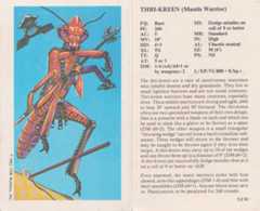 The First Edition Thri-Kreen are basically a direct port in from the Monster Cards. They made the leap from accessory to the Monster Manual 2, where they appeared along side the Thessalhydra and the Thunder Beast, who will definitely be showing back up later on.