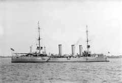 After leaving Mainz, Tyrwhitt’s ships began to receive fire from the north. Arethusa caught sight of Stralsund through gaps in the mist, returning to the attack, and fired on her. Fearless moved across Arethusa’s stern to assist the destroyers of her 4th Division after the pounding they had received from Mainz. As she did so, Fearless saw a further two German light cruisers coming down from the north-east, SMS Cöln, flying the flotilla admiral’s flag, followed by Stettin. Further to the rear was the German light cruiser, SMS Ariadne.