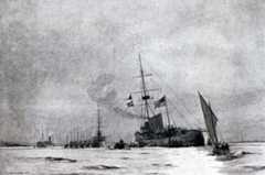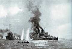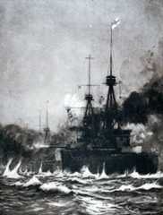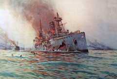 British destroyers engaging SMS Mainz during the Battle of Heligoland Bight on 28th August 1914 in the First World War: picture by Lionel Wyllie