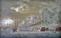 Danish floating battery and ship of the line under fire at the Battle of Copenhagen on 2nd April 1801 in the Napoleonic Wars
