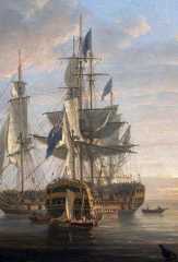Warships carried their main armament in broadside batteries along the sides. Ships were classified according to the number of guns carried, or the number of decks carrying batteries. The size of gun on the line of battle ships was up to 24 pounder, firing heavy iron balls or chain and link shot designed to wreck rigging. The first discharge, loaded before action began, was always the most effective.