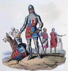 Uniforms, arms and equipment in the Battle of Poitiers: Depending upon wealth and rank a mounted knight of the period wore jointed steel plate armour incorporating back and breast plates, a visored bascinet helmet and steel plated gauntlets with spikes on the back, the legs and feet protected by steel greaves and boots, called jambs. Weapons carried were a lance, shield, sword and dagger. Over the armour a knight wore a jupon or surcoat emblazoned with his arms and an ornate girdle.