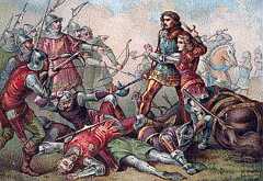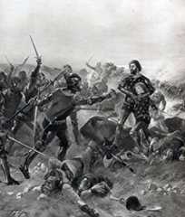 As the French army toiled up to the hedgerow the English force broke through the hedge and struck the French like a thunderbolt, the impetus of the charge taking the mounted knights and men-at-arms right into the French line. Simultaneously Captal de Buch’s Gascons charged in on the French flank. The English and Welsh archers left their bows and ran forward to join the fight, brandishing their daggers and fighting hammers.