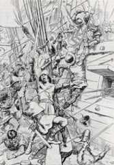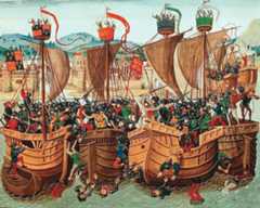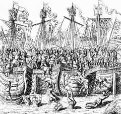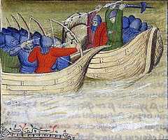 In battle a ship would lay alongside an enemy, decimate her crew with discharges of arrows and showers of heavy stones, leaving the way clear for men-at-arms to board overcome the survivors and take the ship and its crew. It seems to have been the practice of the time to throw captured enemy soldiers over the side unless they seemed sufficiently well equipped to be worth a ransom.