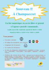 Un nouveau service est disponible à l’agence postale de Champsecret : un îlot numérique. Un ordinateur est ainsi mis à votre disposition aux heures d’ouverture de la mairie.