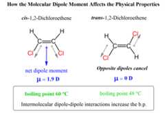 As a result, thetrans isomer is a non-polar molecule with a lower boiling point (48o vs 60o C) than thecis-dichloroethene because of theintermolecular dipole-dipole interactions in the latter.