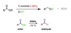 Esters can bereduced to alcohols or aldehydes usingLiAlH4 andDIBAL respectively: