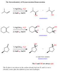 Notice from the last reaction thatdiastereomers can also be formed if the product contains two or morechirality centers. This is because while the newly forming centers are going to beR and S, the original chirality center is intact, thus the alcohols are not mirror images. Let’s also show the mechanism of how diastereomers can form in oxymercuration-demercuration reactions: