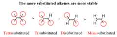 Notice that thetransition state of the E2 mechanism resembles an alkene (the double bond is already partially formed), thus, increasing the number of alkyl groups makes the forming alkene more stable, which lowers the activation energy. Therefore, the reaction goes faster, and the resulting alkene, being more substituted, is more stable.