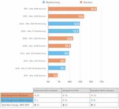 This is not to say redistricting hasn’t had a big impact. Sorting has enhanced partisan mapmakers’ ability to partition states into safe seats. And on a net basis, redistricting has helped bolster Republicans’ edge in the House: the number of Republican (R+5 or greater) seats has grown by 14 as the result of changes to district lines, while the number of Democratic (D+5 or greater) seats has increased by just two.