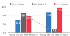After the hyper-polarized 2016 election, there are only 72 districts between D+5 and R+5—less than one sixth of the House and a56 percent decline since 1997. This also represents a 20 percent decline from just four years ago, when there were 90 swing seats.