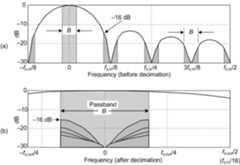 ThoseB-width shaded spectral bands centered about multiples offs,in/R in Figure 7(a) will alias directly into our desired passband after decimation byR = 8 as shown in Figure 7(b). Notice how the largestaliased spectral component, in this 1st-order CIC filter example, is 16 dB below the peak of the band of interest. Of course the aliased power levels depend on the bandwidthB; the smallerB the lower the aliased energy after decimation.