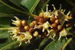 Identification: A fast-growing evergreen tree with a dense, irregular crown, generally growing around 45 feet tall, occasionally up to 100 feet. Wind resistant. The yellow fruit is ellipsoid, about an inch long and three-quarters of an inch wide, containing a single large seed, grows along branches. The trunk and bark can have warty looking growths and the bark flakey.Leaves yellowish green to dark green, shiny, elliptical to oblong. The toothless leaves can be wavy and cluster toward the end of branches.