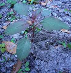 IDENTIFICATION: Annual growing to three to six feet, is frost tender. Coarse, hairy, stout stems, leaves usually dull green on long stalks, prominent veins, oval to lance shaped, often notched when young; flowers clusters dense, bristly, small and usually green, terminal clusters and out of where leaf meets stem.