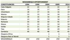 The boundaries of Mozambique’s constituencies for the Assembly of the Republic (Assembleia da República) for correspond to those of its 10 provinces and capital district. Starting in 2004, it added two constituencies for diaspora voters, one for Mozambicans living in Africa and another for Mozambicans who live elsewhere.Seats are apportioned to provinces before each election based on the number of registered voters with 1 seat apiece allocated to the 2 diaspora constituencies. Here is the past apportionment of seats: