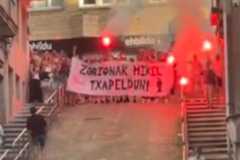 Oyarzabal, recibido por su cuadrilla en Eibar a ritmo de la Potra Salvaje frente a la sede de Bildu