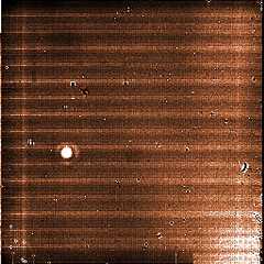 A raw image straight from VISIR. As the instrument observes in the thermal infrared, the individual exposures are extremely short, and the final image is obtained by combining hundreds, or even thousands, of individual snapshots obtained at slightly different positions. This technique allows astronomers to beat the incredibly bright background from the sky and from the telescope itself. It also allows them to correct for the many defects of the tiny detector, which appear here as dark and bright spots, as well as structure in the background. This image was one of the many that was used to produce the view of the star Betelgeuse further up this page. |