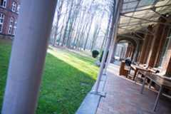 De tuin en het gebouw gefotografeerd vanaf de boszijde.