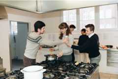 De gemeenschappelijke studentenkeuken. Genoeg plek voor alle kookgroepen.