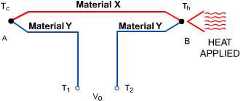 1.4.1 SEEBECK EFFECT: To illustrate the Seebeck Effect let us look at a simple thermocouple circuit as shown in Figure (1.1). The thermocouple conductors are two dissimilar metals denoted as Material x and Material y.
