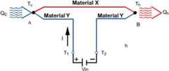 If a voltage (Vin) is applied to terminals Tl and T2 an electrical current (I) will flow in the circuit. As a result of the current flow, a slight cooling effect (Qc) will occur at thermocouple junction A where heat is absorbed and a heating effect (Qh) will occur at junction B where heat is expelled. Note that this effect may be reversed whereby a change in the direction of electric current flow will reverse the direction of heat flow. The Peltier effect can be expressed mathematically as: