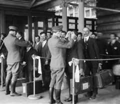 Prima, però, i migranti, spesso vestiti con i loro abiti migliori, venivano fotografati e schedati. Tra il 1906 e il 1914 Augustus Francis Sherman, fotografo amatoriale nonché impiegato capo al registro di Ellis Island, fece numerose fotografie a scopo personale.