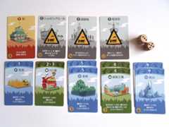 17種類の施設カード、3種類のコイン、2個のダイスが同梱されています。
