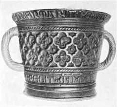 In early mediaeval times it is probablethat bell-founding was largely the workof the monastic orders. It was regardedrather as a fine art than a trade, and ecclesiasticsseem to have vied in producingthe most ingenious and recondite Latinrhyming verses to adorn their bells.S. Dunstan, whose skill as a smith isfamiliar to all, is known to have beeninstrumental in hanging, if not in castingbells; and at Canterbury he gave carefuldirections for their correct use. S. Ethelwold,Bishop of Winchester 963–984, castbells for Abingdon Abbey. In the museumat York there is a mortar of bell-metal castby Friar William de Towthorpe, with the[Pg 22]date 1308 (Plate11); but this belongs tolater times, when a class of professionalfounders had sprung up, and is thereforeexceptional. We read, however, of SirWilliam Corvehill, a monk of WenlockPriory, who died shortly after its dissolution,in 1546, that he “could make organs,clocks, and chimes,” and was “a good bell-founderand maker of the frames for bells.”It has not been possible to trace his workin any existing bells.