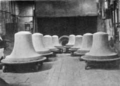 The process of casting a bell, as employedboth by ancient and modern founders, maybe described somewhat as follows:—Thefirst business is the construction of thecore, a hollow cone of brick somewhatsmaller than the inner diameter of theintended bell, over which is plastered aspecially-prepared mixture of clay, bringing[Pg 13]it up to the exact size and shape of theinterior of the bell. This was usuallymodelled with the aid of a wooden “crook,”something like a pair of compasses; butis now done with an iron framework calleda “sweep,” which revolves on a pivot andmoulds the core by means of metal blades.This clay mould is then baked hard bymeans of a fire lighted within it. Thenext stage was the construction of thecope or outer casing of the mould, whichused to be also made in hard clay, its innersurface following theouter shape anddimensions of the bell. The “thickness”of the bell itself, i.e., the part to be occupiedby the molten metal, was formedin a friable composition which was laidover the core and then destroyed. Inmodern times the “thickness” has beendispensed with, the cope being formed bylining a casing of cast iron with clay shapedto the external form and dimensions of thebell. The mould is now complete, exceptfor providing for the cannons or metal[Pg 14]loops which attach the bell to the stock,and the loop to which the clapper is suspendedinside. Every care having beentaken to adjust the respective positions ofthe cope and core with exactness, themolten metal is then poured in throughan opening, and left to cool, after whichthe bell comes out complete. The processis analogous to that known ascire perdu,employed by sculptors for the casting ofbronze statues. Illustrations of the mouldingprocesses are given in Plates6–10.