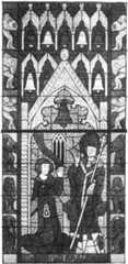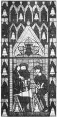 The other two lights have as their mainsubjects scenes from the actual processesof bell-founding. In the left-hand light(Plate9) we have the forming of theinner mould or “core,” as already de[Pg 17]scribed.One figure is turning it witha handle like that of a grindstone, whileanother moulds the clay to its proper formwith a long crooked tool. The core restson two trestles, between the legs of whichtwo completed bells are seen; above area bell and a scroll with the founder’s name.In the right-hand window (Plate10) arethree figures engaged in running themolten metal, which is coloured red. Themetal is kept heated in the furnace bymeans of bellows, worked by two boys,while the chief workman watches themolten stream running into the mould.
