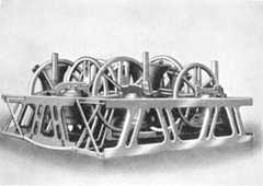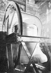 The frames are made separately, andthe bells hung on them in the tower withtheir headstocks already attached[1]; untilrecently all these fittings were made ofwood, and iron or brass were only usedfor the smaller parts, but it is now thecustom of some founders to employ ironframes, and even iron stocks, which maybe an improvement in lightness and stability,or for ringing purposes, but arehardly so in appearance.