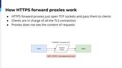 One last point that I want to mention is why we did not get a normal HTTPS proxy. The issue is that with normal HTTPS proxies is that they will just open a TCP socket between you and the target and you are still responsible for everything that’s in the middle. So, maybe they can redo the TCP connection if that fails, but they will not be able to do very much more. We wanted to do something better than that, so we wanted the proxy to know about the request and to be able to do the TLS negotiation and all that stuff, which is not possible with a normal HTTPS proxy.