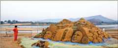 Sand and sandstone: Renowned sand artist Sudarshan Pattnaik (in orange) sculpted these twin faces of the rivers Narmada and Tawa during a river festival held at their confluence, known as the Bandrabhan Sangam;