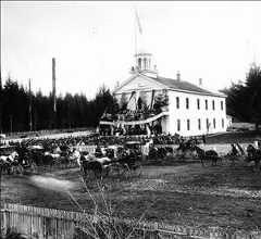 In the afternoon, Governor Ferry, joined by former Governor Moore, judges, and military commanders, "reviewed the militia from a balcony of the Woodruff block, one of the fancy new commercial buildings of downtown Olympia" (Newell, 126). The troops paraded and performed maneuvers on the muddy downtown streets in front of a large crowd.