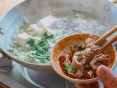 豚こま肉、キャベツをにんにく香るスープで煮て、塩や花椒を混ぜた「唐辛子塩」をつけて食べれば、素朴ながらインパクトは大!