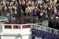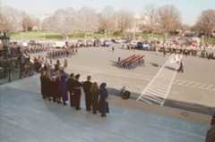 President William J. Clinton, First Lady Hillary Clinton, Vice President Gore, Second Lady Tipper Gore, and their families, along with Maj. Gen. Bradley A. Becker, U.S. Army, is commander of the Joint Force Headquarters-National Capital Region (JFHQ-NCR), stand on the steps of the East Front to participate in the Pass in Review prior to departing the Capitol for the Inaugural Parade to the White House.