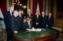 After the departure of the former President and First Lady, the new President gathers in the President’s Room just off of the Senate Chamber to sign nominations and sometimes memorandums, proclamations, or executive orders. President Clinton, surrounded by the JCCIC Members and Vice President Gore, signs his first official actions taken as the newly sworn President of the United States.