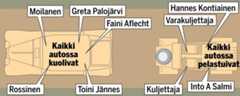 – Auton jäänteet savusivat vielä. Kenraali Palojärven rouva oli palanut siihen ovelle. Se oli yrittänyt ulos, mutta tullut ammutuksi. Kaksi sotilaskotinaista ja kaksi korpraalia oli ammuttu samaan paikkaan. Saattosotilaiden auto oli parisataa metriä jälempänä. Se oli ammuttu seulaksi. Pyörän eteen oli jäänyt 30 sentin päähän miina.