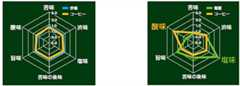 システムを使って分析すると、六角形のレーダーチャートで表示される。「苦味」「渋味」「塩味」「苦味の後味」「旨味」「酸味」の6項目に分けて数値化。一般的に相性のいい組み合わせは、チャートを重ねたときに「味の重なり合い」や「補い合い」の傾向がみられるという。