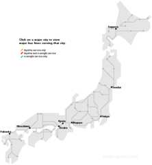 Japan is covered by a dense network of daytime and overnight highway bus lines. Everyprefecture andlarger city is served by at least one bus company, operating lines into other parts of the country. On a few popular routes, especially routes to/fromTokyo, numerous companies are competing against each other, while on other routes they are often cooperating rather than competing. The map below shows some of the major highway bus lines: