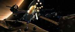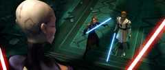 Späterattackierte die Konföderation unabhängiger Systeme den rohstoffreichen Planeten Christophsis und etablierten im Orbit der Kristallwelt eine Blockade, die vonAdmiralTrench angeführt wurde. Da deralderaanische SenatorBail Prestor Organa auf der Planetenoberfläche festsaß und die dortigen Truppen koordinierte, sich die Reihen jedoch stark ausdünnten, entsandte die republikanische Führung eine Flotte, um den Planeten zu befreien. Angeführt von den Jedi-Generälen Obi-Wan Kenobi und Anakin Skywalker setzte die Republik ein neuartigesTarnschiff ein, um an der Blockade unbemerkt vorbeizufliegen. Es gelang, den Sensoren der separatistischen Armada zu entgehen und sogar das Flaggschiff zu zerstören, sodass die konföderierte Flotte über Christophsis unkoordiniert war.[53] Mit dem ersten Sieg über den Planeten gaben die konföderierten Truppen jedoch nicht auf. Es gelang der Dunklen Jedi Asajj Ventress, den KlonkriegerSlick auf die Seite der Separatisten zu ziehen, um so an geheime Informationen bezüglich der Kriegsplanung auf Christophsis zu gelangen. Während eines Angriffs der Droiden konnten die Separatisten die republikanischen Truppen unter Anakin Skywalker und Obi-Wan Kenobi zurückdrängen, da sie den Aufenthaltsort des republikanischen Unterschlupfs kannten. Als Kenobi und Skywalker eine Erklärung für diese Tatsache suchten, gelangten sie in das konföderierte Hauptquartier, wo sich ihnen Asajj Ventress entgegen stellte. Nachdem die Jedi Ventress zurückgedrängt hatte, offenbarte sie ihnen, dass der Kampf nur eine Taktik war, um die Jedi von der Tatsache abzulenken, dass dutzende separatistische Verstärkungsschiffe auf Christophsis landeten.[54]