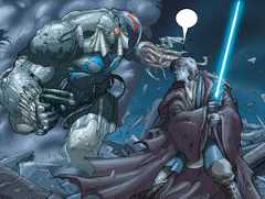 Dennoch waren die Kämpfer unter Alto Stratus auf ihrem vertrauten Boden klar im Vorteil und so wurde ein schneller Sieg für die Republik immer unwahrscheinlicher. Stattdessen litt die GAR unter langen Nachschubwegen, schlechtem Vorankommen im matschigen Boden, dem demoralisierenden Dauerregen und den atmosphärischen Störungen, die eine Versorgung und Fortbewegung in der Luft unmöglich machten. Schließlich steckte die Republik in ihrem Hauptquartier fest und Alto Stratus startete einen Großangriff, bei dem Hunderte ums Leben kamen. Auch Obi-Wan Kenobi und sein Klon-BegleiterA-17 wurden für tot gehalten. Tatsächlich jedoch waren beide in die Hände von Asajj Ventress gefallen, die mittlerweile einen persönlichen Hass auf Kenobi entwickelt hatte, weil er ihr so oft in die Quere gekommen war. Sie entführte beide in ihre Festung nach Rattatak.[9] Anakin Skywalker wurde einer Gruppe von "verwaisten" Padawanen zugeteilt und Jedi-GeneralLeska übernahm das Kommando über die Operation. Ihre Führung währte nicht lange, denn im zweiten Monat der Schlacht kam sie bei einer erneuten Großoffensive durch Alto Stratus ums Leben. Die Republik wurde angesichts der Übermacht der Gegner zum Rückzug von Jabiim gezwungen. Die Padawane übernahmen die undankbare Aufgabe, den Rückzug der Streitkräfte zu decken und erlitten dabei schwerste Verluste. Lediglich Anakin Skywalker überlebte das Massaker, weil Palpatine persönlich dafür sorgte, dass er sich während der Evakuierung in Sicherheit befand. Jabiim war eine der schwersten Niederlagen der Republik während der Klonkriege. Nach der Rückkehr von Jabiim wurde Anakin Skywalker demTusken und Jedi-RitterA'Sharad Hett zugeteilt. Während der folgenden Monate war Anakin stets überzeugt davon, dass Obi-Wan Kenobi noch lebte. Tatsächlich gelang es Kenobi und A-17, trotz ihrer schweren Verletzungen, die sie durch die wochenlange Folter erlitten hatten, von Rattatak zu fliehen und zur Republik zurückzukehren. Nach dieser Flucht wurden von der Konföderation Kopfgelder auf die wichtigsten Jedi ausgesetzt. So waren Mace Windu und Yoda 1.250.000 Credits wert, während Anakin - als Padawan - immerhin noch 225.000 Credits einbrachte. Dadurch hoffte man, auch die besten Kopfgeldjäger für die Konföderation gewinnen zu können.[111]