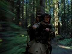 Nachdem der Rebellen-Stoßtrupp mithilfe derTydirium erfolgreich zur Landung auf dem Waldmond ansetzen konnte, marschierte die Truppe durch das dichte Unterholz der unübersichtlichen Gegend und musste dabei eine Begegnung mit der imperialen Patrouille vermeiden. Der Stoßtrupp bot keine militärischen Voraussetzungen, um einen offenen Kampf mit den zahlenmäßig überlegenen Sturmtruppen austragen zu können. Trotz der Bemühungen stieß die Gruppe um Han Solo auf eine Zwei-Mann-Patrouille, die die Umgebung mitDüsenschlitten absuchte. Luke und Leia erbeuteten zusammen einen Düsenschlitten und nahmen die Verfolgung der flüchtigen Spürtruppen auf. Fieberhaft versuchten die Imperialen zu ihrer Basis zu gelangen, um die Ankunft der Rebellen zu melden. Eine Nachricht mittels Funk war aufgrund einer von den Rebellen verursachten Störung nicht möglich. Während der Verfolgungsjagd, bei der Luke und Leia mit einer Geschwindigkeit von über 300 km/h durch den dicht bewachsenen Wald rasten, konnte Luke einen Spürtruppler von seiner Maschine stoßen und dessen Düsenschlitten einnehmen. Die Hetzjagd endete als Luke von seinem Düsenschlitten sprang und seinen Verfolger mit dem Lichtschwert aus der Luft schlug. Leia wurde von einem Truppler abgeschossen, der kurz nach deren Sturz selbst an einem Baum zerschellte.[4]