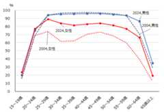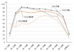 [注3] 有配偶の労働力率について、2004年はすべての年齢階級で掲載しているが、2024年の「15~19歳」の労働力人は数値が表章単位に満たないため、図表2に掲載していない。