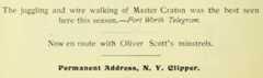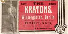 I cannot help mentioning The Kratons who were at their peak around 1908-09. The Kratons were not in the same category as Rastelli, Cinquevalli, or a host of other jugglers of world renown. They were primarily and exclusively, hoop rollers. They billed themselves as, “The Only Act Of Its Kind,” and they certainly lived up to that billing. For originality they were in a class by themselves. I cannot recall any other act presented like theirs. Imagine, if you can, a stage setting of a city with its stores, church, school, saloon, factory, and other buildings that a city boasts of. These buildings were busy places while The Kratons were doing their act.