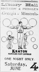 Variety (10-5-1907) described their act as follows. “A special set of a miniature village is used, showing residences, shops, police station and saloon. The men, women, policeman and cowboys, all represented by the hoops, are distinguished by various colors, a table being printed on the program, making it easy to follow. After the first four minutes, in which time the couple do seemingly the fastest and best hoop rolling and juggling possible, both leave the stage, the hoops thereafter going and coming from the various buildings with remarkable speed and accuracy. The whole act is a constant succession of comedy surprises. The “drunken” hoops which leave the saloon, stop, start back, and then go ahead, as well as the “cowboy” hoops that come out, pick up handkerchiefs, and then return, are not only amusing and interesting but puzzling. Nothing like it has been seen before. The offering closes with a prisoner breaking jail, and a chase by the police. The hoops rapidly follow one another across the stage in and out of the various buildings, the chase finally ending with the prisoner’s capture and return to jail. It makes a good, snappy finish to a novel and most excellent act.”