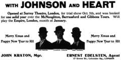 The Kratons were wildly successful from about 1907 until Harry’s death on October 10, 1912. The act continued without Harry until at least 1917, with Harry’s brother John and Clarence and Leonora Johnson making up the troupe. A photo of John Kraton (1884-1933) is below.
