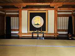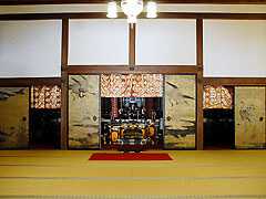 【重要文化財 本坊】このお部屋は、先の上段の間と結ばれている「武者隠し」の間で、天皇に随行された人が不寝番をしていた部屋です。後には旧伯爵副島家より伝承された地蔵菩薩を奉安するようになりました。襖の絵は山本(狩野)探斎の筆と伝えられています。