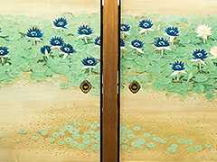 襖絵は石崎光瑤(いしざきこうよう)画伯の大作で「雪山花信」の題によりヒマラヤとヒマラヤシャクナゲの風景が描かれています。残念なことに、画伯は完成途上に亡くなられたため奥殿裏の襖絵などは描かれず、一部の襖絵は未完成のままとなり、現在では石崎光瑤画伯の最後の遺作となってしまいました。