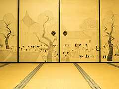 【重要文化財 本坊】襖の絵は梅月流水(ばいげつりゅうすい)で、筆者は斎藤等室(さいとうとうしつ 1588年~1668年)であると伝えられています。描かれている絵図から梅の間と呼ばれています。